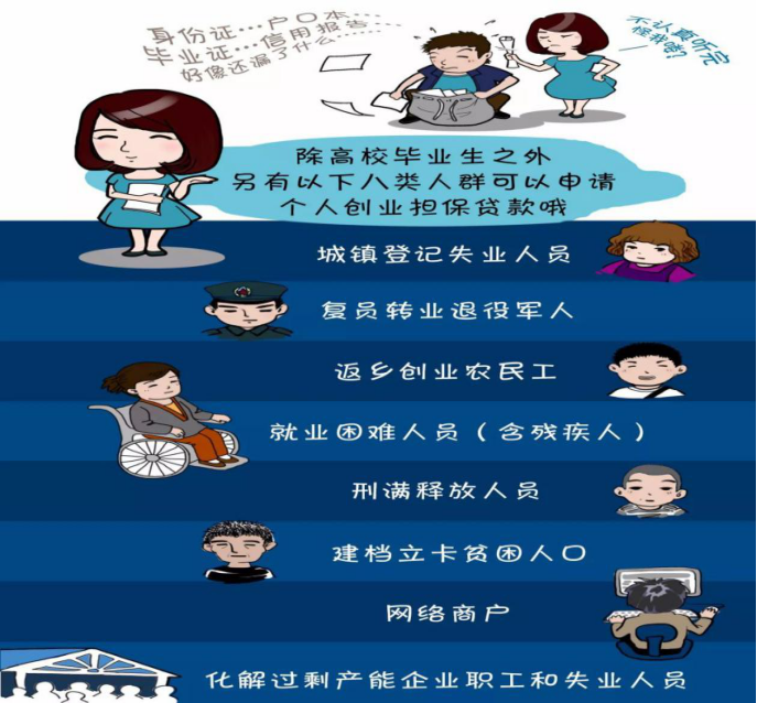 ①城镇登记失业人员。②就业困难人员(含残疾人)。③复员转业退役军人。④刑满释放人员。⑤高校毕业生(含大学生村官、在校高年级大学生、休学创业大学生和留学回国学生)。⑥化解过剩产能企业职工和失业人员。⑦返乡创业农民工。⑧网络商户。⑨建档立卡贫困人口。⑩农村自主创业农民。依托平台就业购置生产经营必须工具的就业人员纳入扶持对象。在我省创业不受户口区域、行业限制。